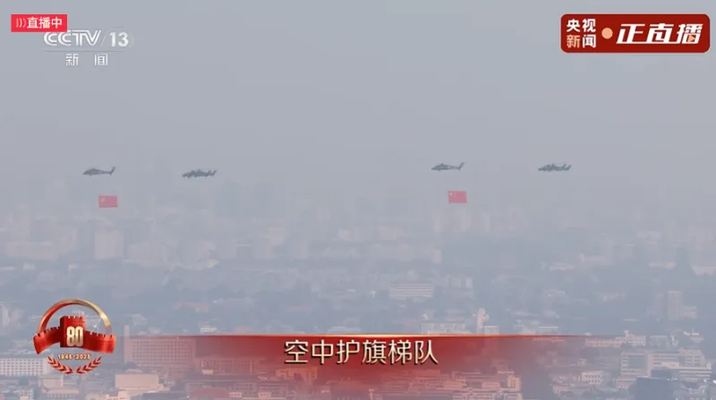 空中护旗梯队由多型直升机组成多个编队,以吊挂旗帜和标语等方式,飞过天安门上空,拉开阅兵分列式的序幕,体现了在党的领导下,国家和军队的发展壮大。