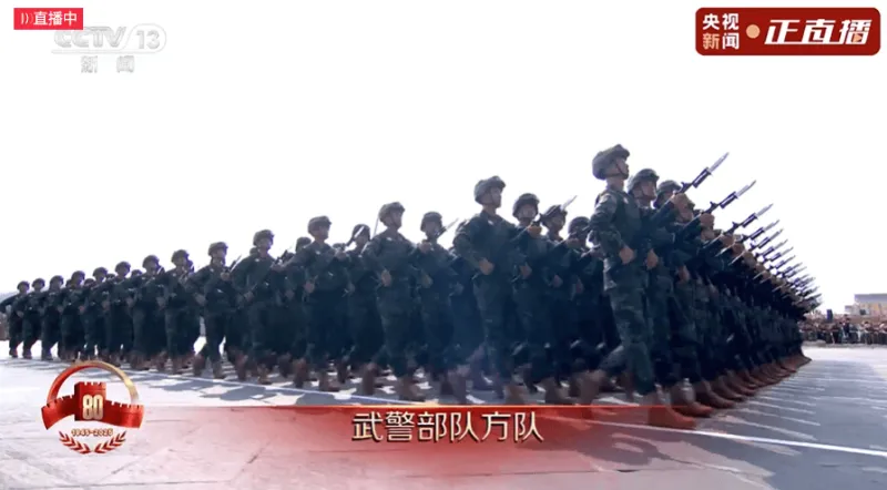 武警部队身着武警制服,以标准的劈枪动作和整齐划一的步伐,展示了武警部队的威严和风采,体现了武警部队在维护国家安全和社会稳定中发挥的重要作用。