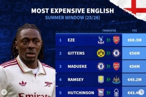 今夏英格兰球员转会费榜:埃泽6930万,吉滕斯、马杜埃凯分列二三